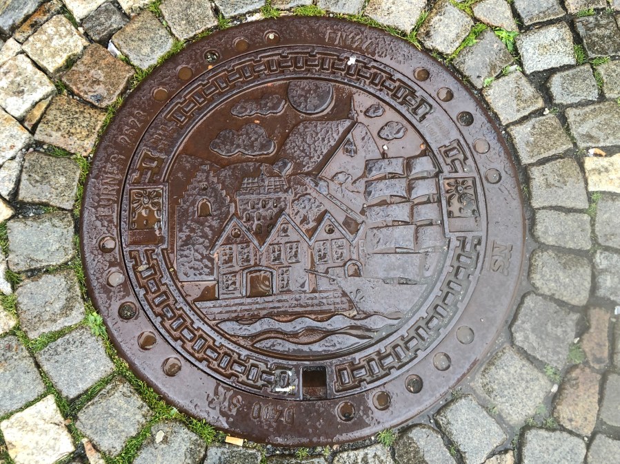 Getting to the first cache turned out to be harder than it appeared on the map. This part of Bergen has several row houses – narrow but long wooden houses facing the water. Between them are passageways or pedestrian alleys along which are shops. I was looking on the map and had chosen the closest passage to the cache, but when I arrived in front of it, it was blocked off. We backtracked to the previous one and followed it to the back of the buildings, only to find a locked gate. We went back to the street and to the alley before this one, and were finally able to reach the courtyard holding the cache. Deban sat in a covered area while I went off in search of the cache. I found it easily, retrieved it, and carried it to a protected place where I could open it without soaking the contents. I was disappointed to find there were no TBs inside, but went ahead and dropped off one that wanted to stay in Europe.
