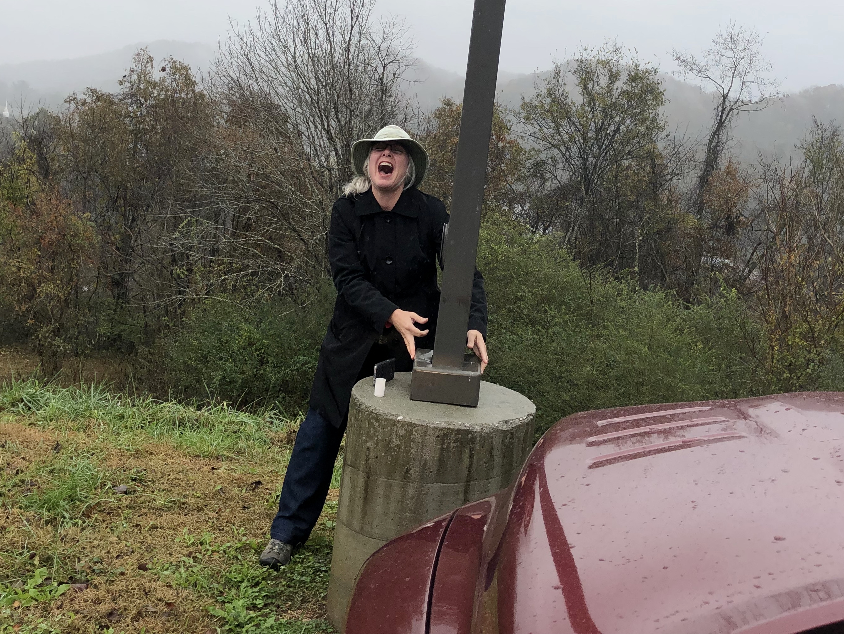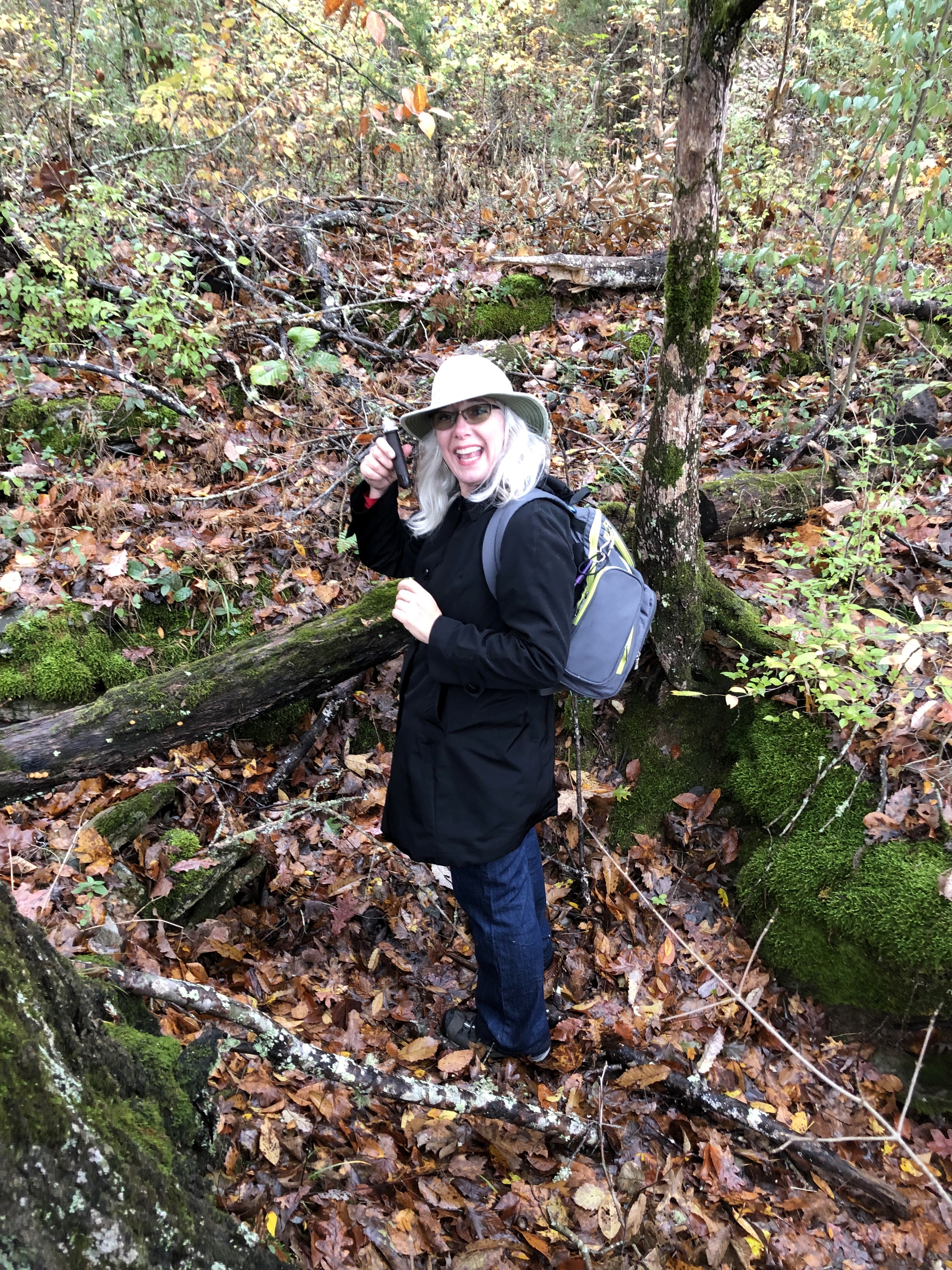 The weather was cool and damp with drizzling rain off and on. I knew this was unique weather for the California gal to be caching in, but she insisted there is no such thing as bad weather – only bad clothing. We were prepared with good clothing, both wearing rain jackets and hats. We logged seven caches in the star series as well as a traditional cache along our route, and then drove into Oak Ridge for lunch at McAlister’s Deli.