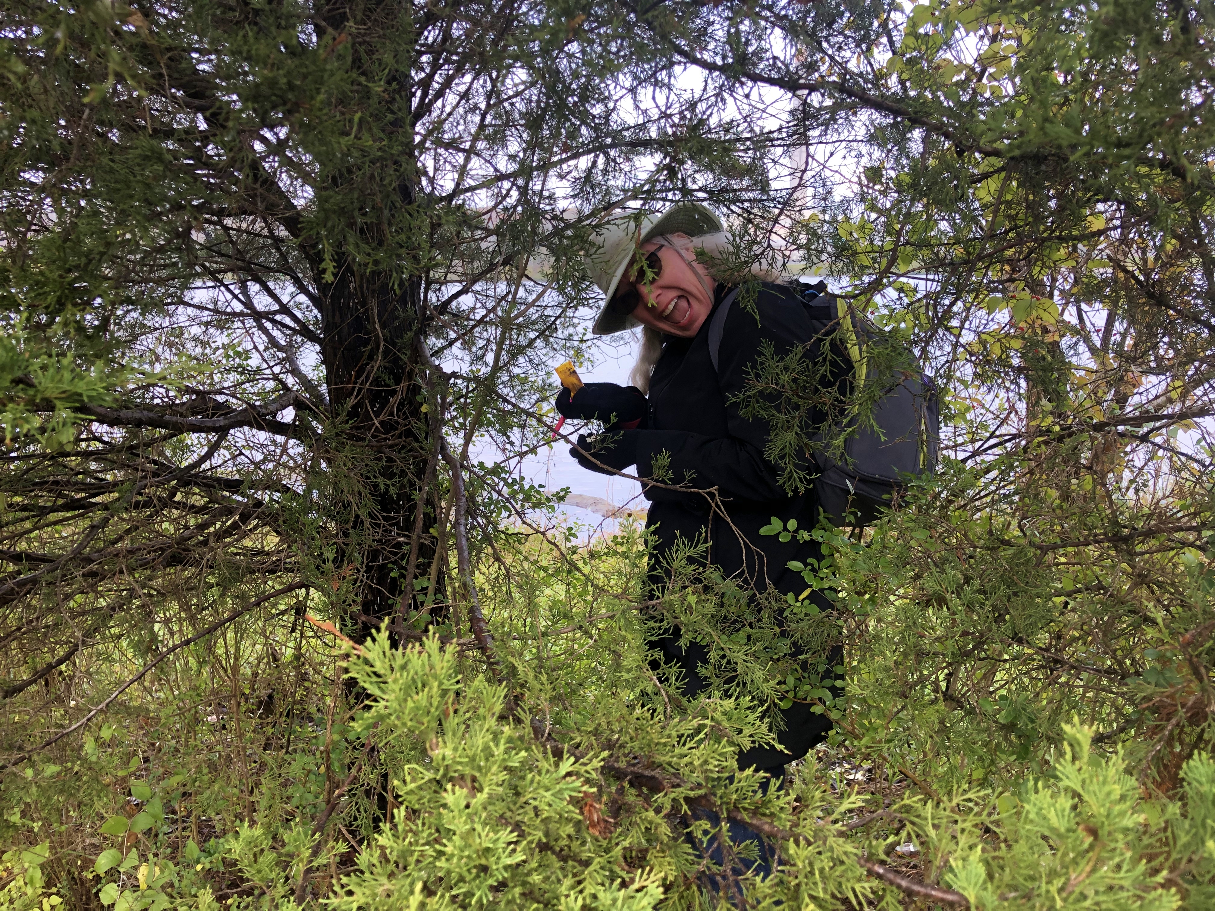 In the meantime, while rewinding the string so that I could try again, I spotted a log sheet in a baggie lying on the ground under the birdhouse. We signed the log sheet and were preparing to leave when I noticed another text from Ang. He had reached out to another cacher and gotten a more helpful reply that indicated the direction we should be searching. I quickly found the cache, we signed the log, and hurried back to the trail.