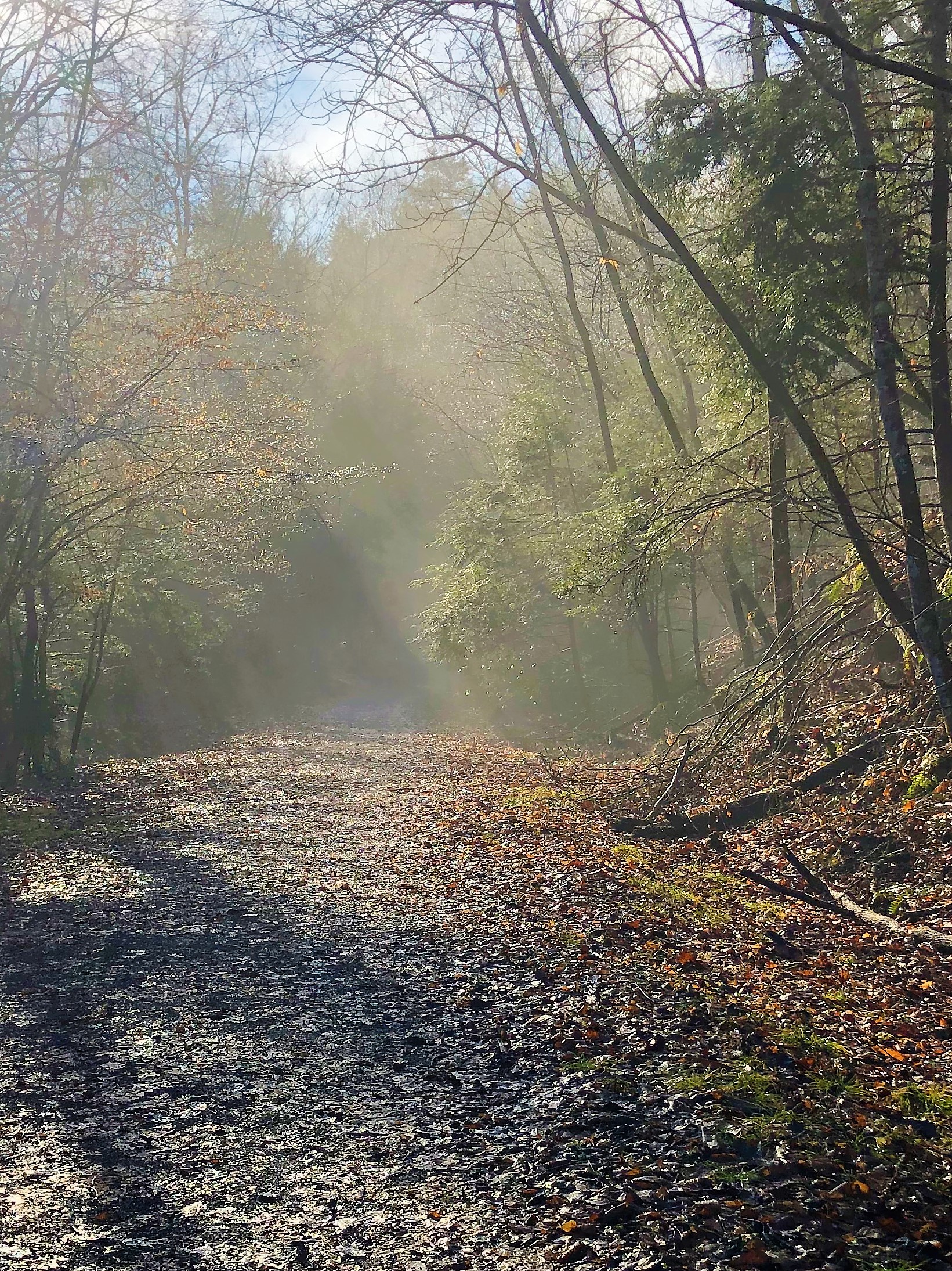 We stopped at the trail head sign to find the first geocache, and it was in the first spot that Rob looked. This was an encouraging start to the day, and we hoped that all of our searches would be that easy. We headed down the trail in high spirits. The sunlight slanting through the fog along the trail was beautiful, and promised to burn off the rest of the fog soon.