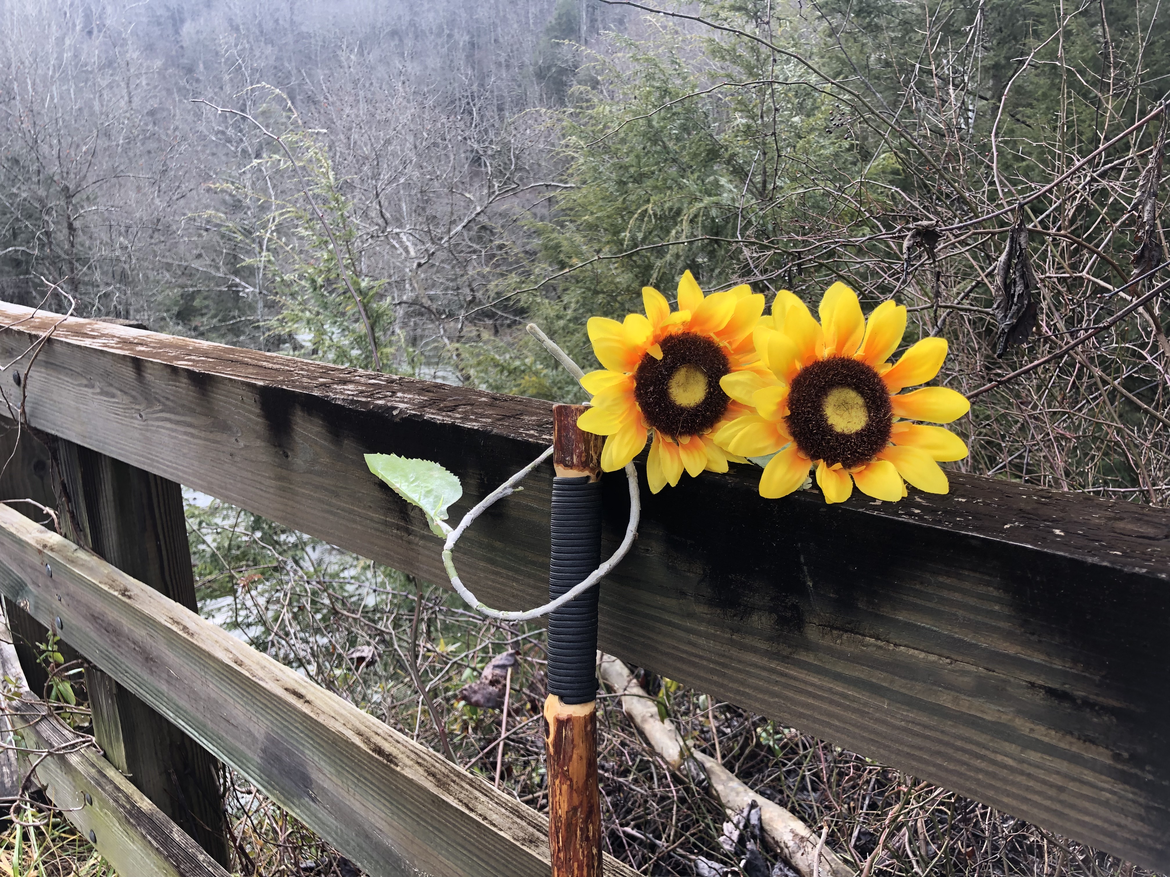 There is a long foot bridge crossing the river a short distance from where we ate lunch. As I approached it, something yellow just past the hand rail caught my eye. Sunflowers blooming in December? They turned out to be fake sunflowers. I wonder how they ended up here? I placed them on the hand rail for others to enjoy.