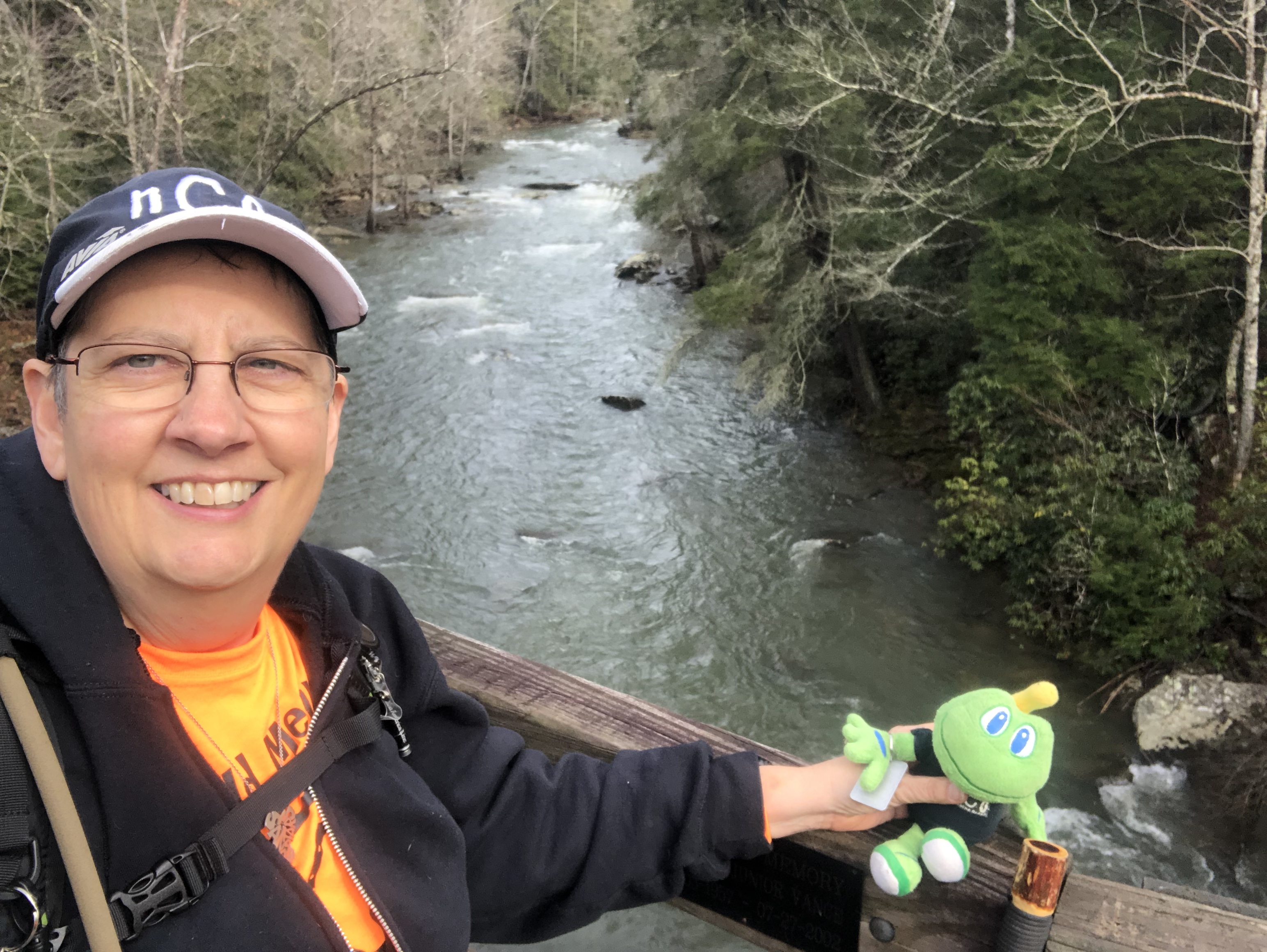 This foot bridge is the site of another EarthCache. It has a geological lesson about the river and how it has shaped the gorge. We collected the information needed to log that cache and continued on the trail.