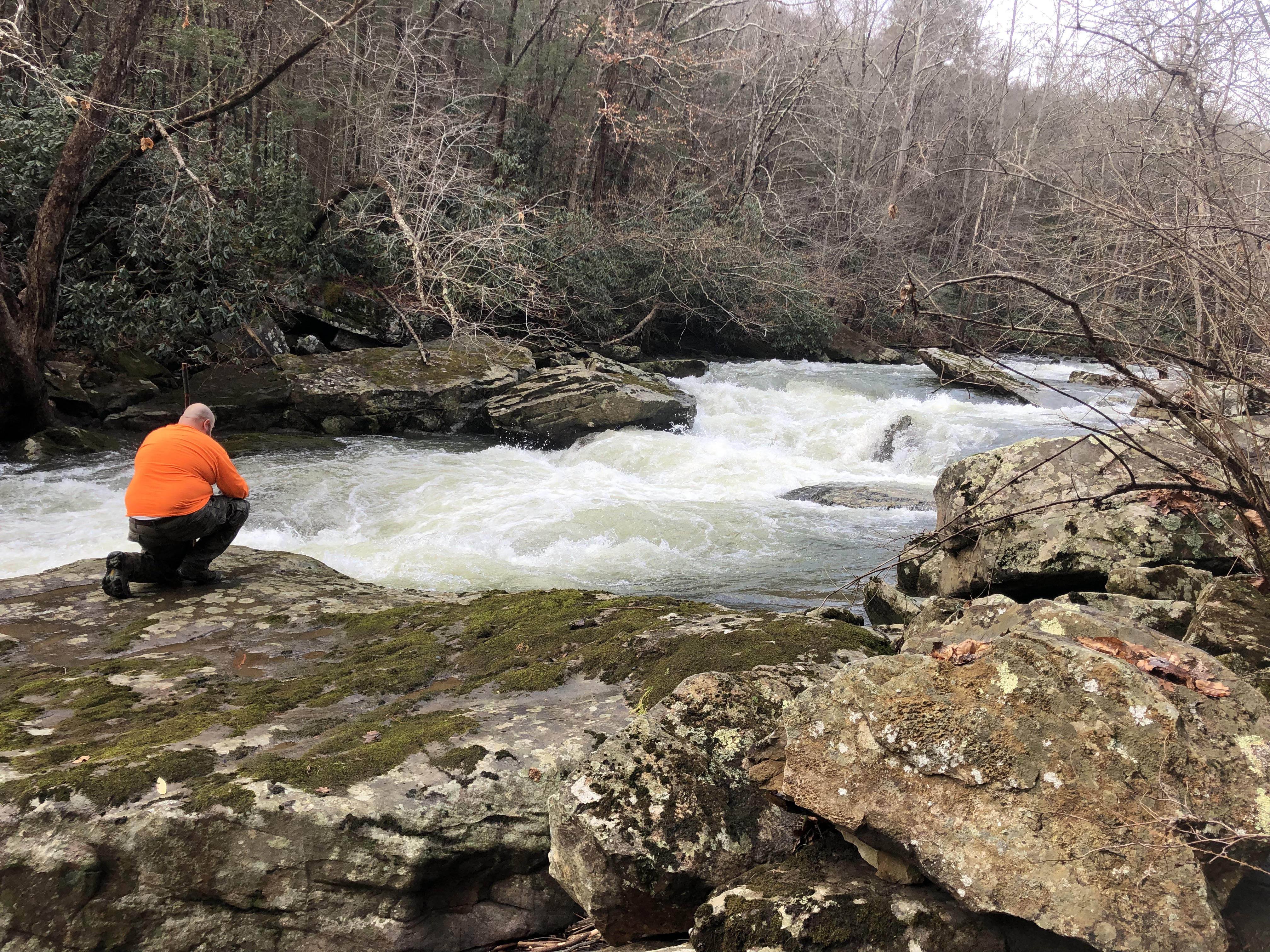 Past the bridge, the trail closely follows the route of the river. With all of the recent rainfall, it was flowing fast and furiously. Many times as we walked along, we stopped to study different rapids. I wondered aloud if people paddle this river, and Rob said that he was sure they did. He said, “That is way above my pay grade, though.” Indeed, this river is for the serious paddlers as it appears to have many Class IV and Class V rapids (on a scale of I to V).