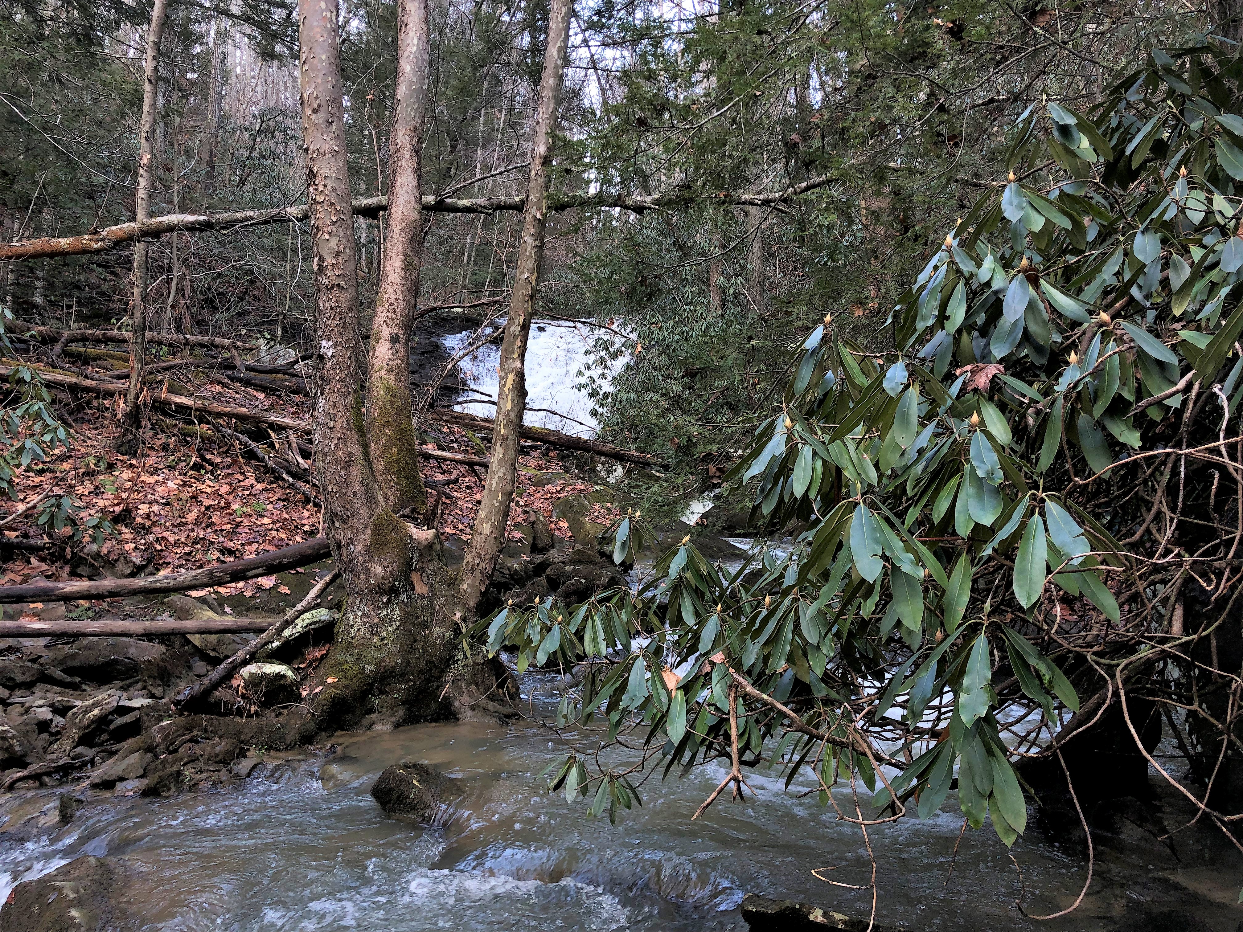 Another cache was hidden under the end of another foot bridge. This bridge crossed a creek that flowed into the Guest River, and upstream from it we could see a nice waterfall. Our maps showed that this was Crab Orchard Branch. We searched for a way to get closer to the waterfall so we could take photos. The terrain dropped off sharply from the trail, but by walking a little further down the trail we found a gentler slope. We made our way down and then back toward the branch, following it upstream toward the falls. Unfortunately, we could not get close to the falls and there was not a good place on this side of the creek to take photos.