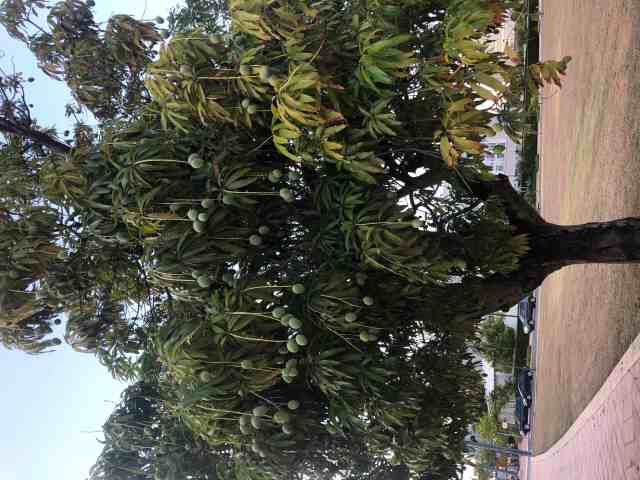 I eventually finished with the cache, hid it back under a pile of rocks, and walked a few blocks to a park area next to a small man-made lagoon. Along the way I encountered an interesting looking tree with lots of green fruit hanging from it. I believe it is a mango tree.