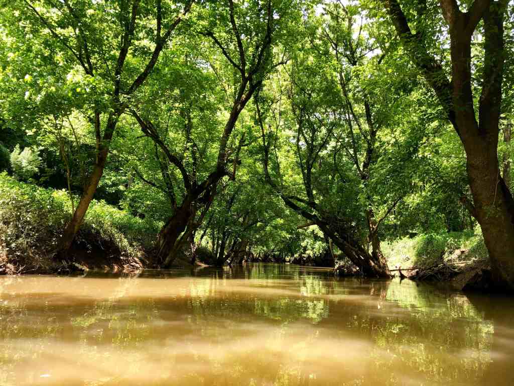 The temperature was in the high 70s and I didn’t see a single cloud in the sky. It was a beautiful day to be on the river. Although I expected very calm water for this trip, I was wearing my spray skirt just in case. Throughout the trip I alternated by having it secured around the outside of the cockpit to prevent water from coming in, and letting it lie loose around my waist.