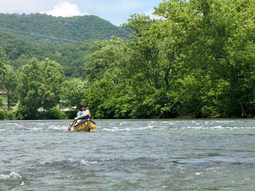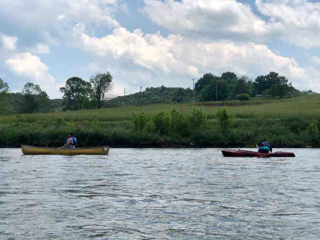 When we arrived at Wadlow Gap, there was a group of folks launching a kayak and several floats. We waited until they had taken off, and then unloaded our boats. We took some time to adjust the seat and foot pegs in Deban’s boat to fit Kara before getting in the water.