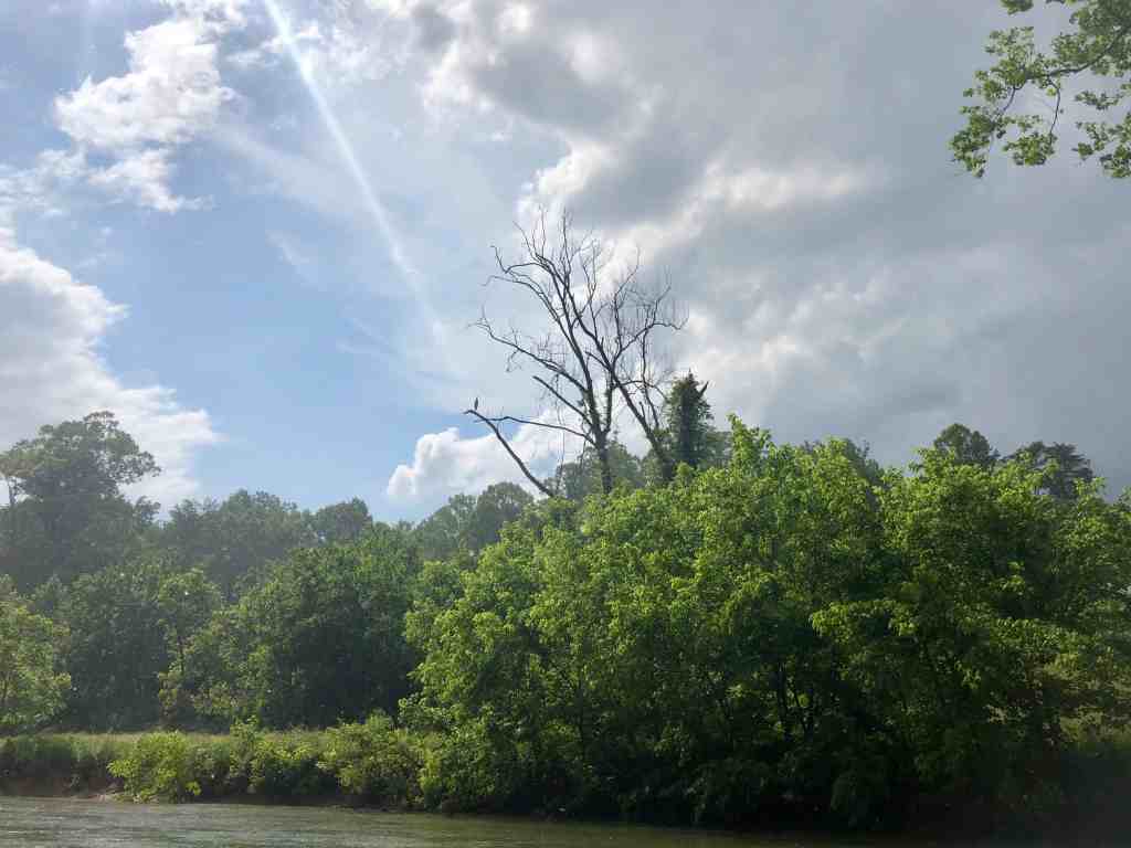 I had begun thinking that I should have put on sunscreen. I had not anticipated being on the water this long. Before long, God took care of that for me. Clouds began to form overhead, and I heard thunder rumbling in the distance. A few minutes later I began seeing the rings that raindrops falling on water create, but commented that I hadn’t felt any raindrops yet. Before long, I began to feel rain, and could see downriver that it appeared to be coming down heavily.
