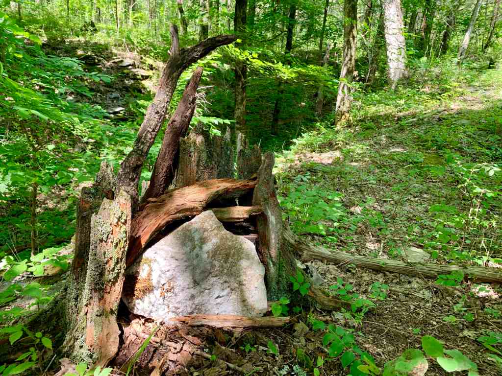 The hint for this geocache was “Think a den with a heavy door.” I immediately spotted a stump with a large flat rock “door” and made my way to it. Behind the rock and under some pieces of wood was the ammo can I was seeking.