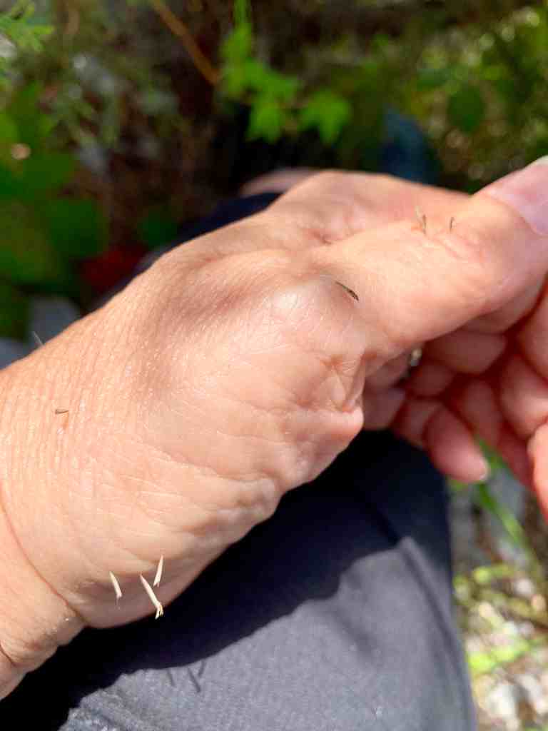 After reaching in to a lower section of the tree where the needles were dry, I pulled my hand out to find it pierced with several tiny needles. I grumbled as I picked them out one by one. It looked as if I had gotten too close to a miniature porcupine.