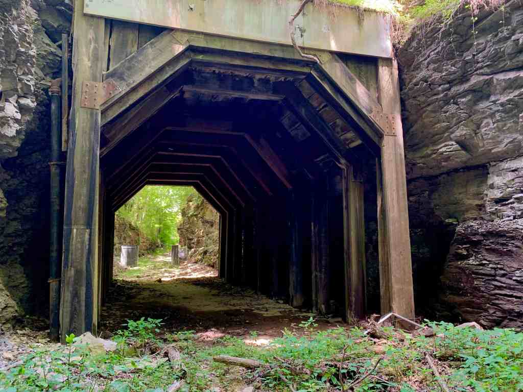 After signing the log sheet, I couldn’t resist exploring the tunnel. From where I stood atop it, I could see where the train tracks had once run below me through a canyon of sorts cut through high rock walls. I followed a path down one side and onto the old rail bed, and then followed it back up to the tunnel.