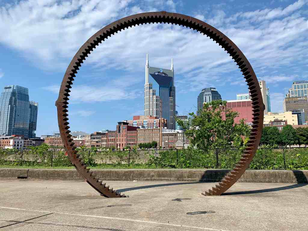 I had already found the other geocache nearby on a previous visit to Nashville, so turned and walked back along the river. I passed the bridge I had crossed on, stopped off to look again for that cache I mentioned earlier. I bushwhacked through dense vegetation downhill toward the water’s edge, but couldn’t get close to the posted coordinates. I did spot a sad, broken scooter down there that someone must have thrown off the bridge. I finally gave up and climbed back out, heading for the nearby Gateway Bridge.