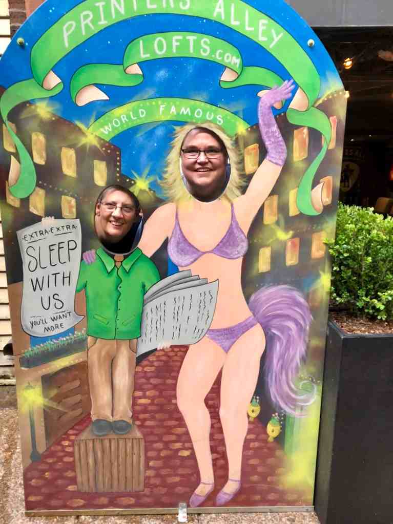 The first was in historic Printer’s Alley. It was difficult to pin point ground zero amidst all the tall buildings. We wandered up and down the alley a few times looking for likely hiding places without success. Since this is a popular spot and it was Friday evening, there were a lot of folks around. We were trying not to look too obvious in our hunt.