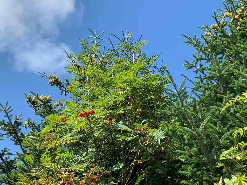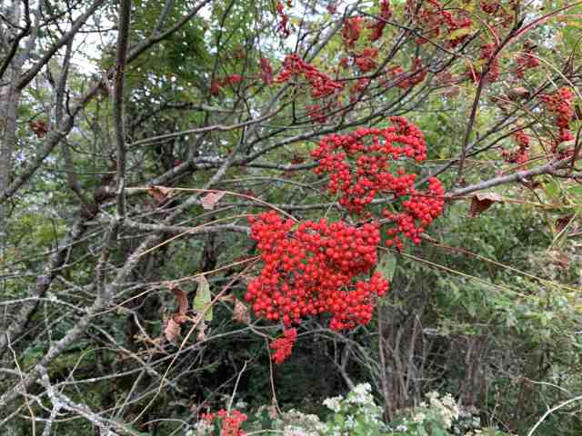 We finally got close enough to the brilliant red that we thought was blossoms in the trees. It turned out to be clusters of berries instead. The leaves of the tree look like locust, but I’ve not been able to find any info on what kind of tree it actually is.