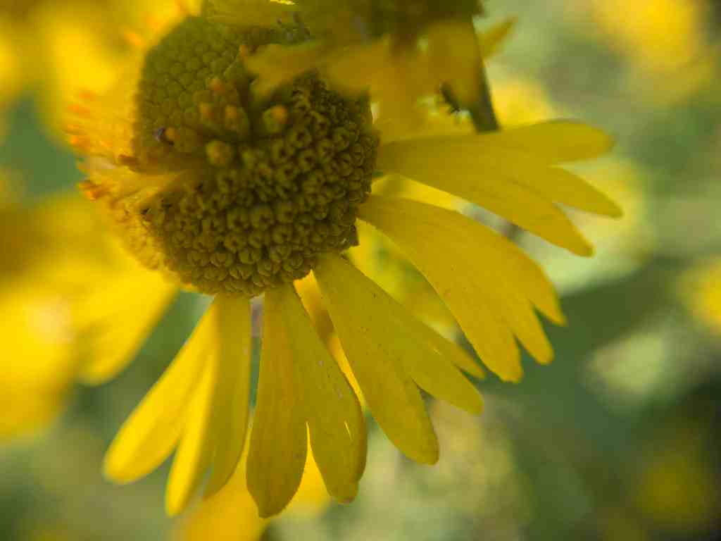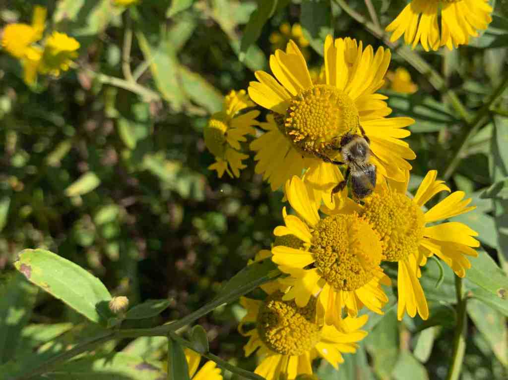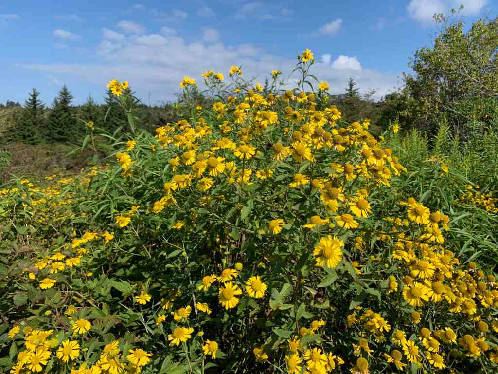 This section of the trail was densely lined with yellow flowers three to five feet tall. They created walls of yellow that we were walking between. I believe that they are common sneezeweed – a type of aster.