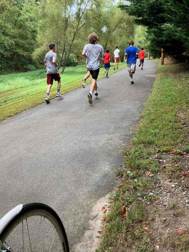 Suddenly, I was surrounded by a herd of teenage boys jogging toward me on the trail. Rather than all passing to my left as one normally would on any trail, they literally swarmed me, passing on both sides and barely parting enough for me to ride through. I honestly thought I was going to hit one or two, but they darted out of the way at the last second. Just before I reached the next cache, a smaller group of teenage girls walked past me. They were chatting and taking their time, moving aside politely unlike the boys.