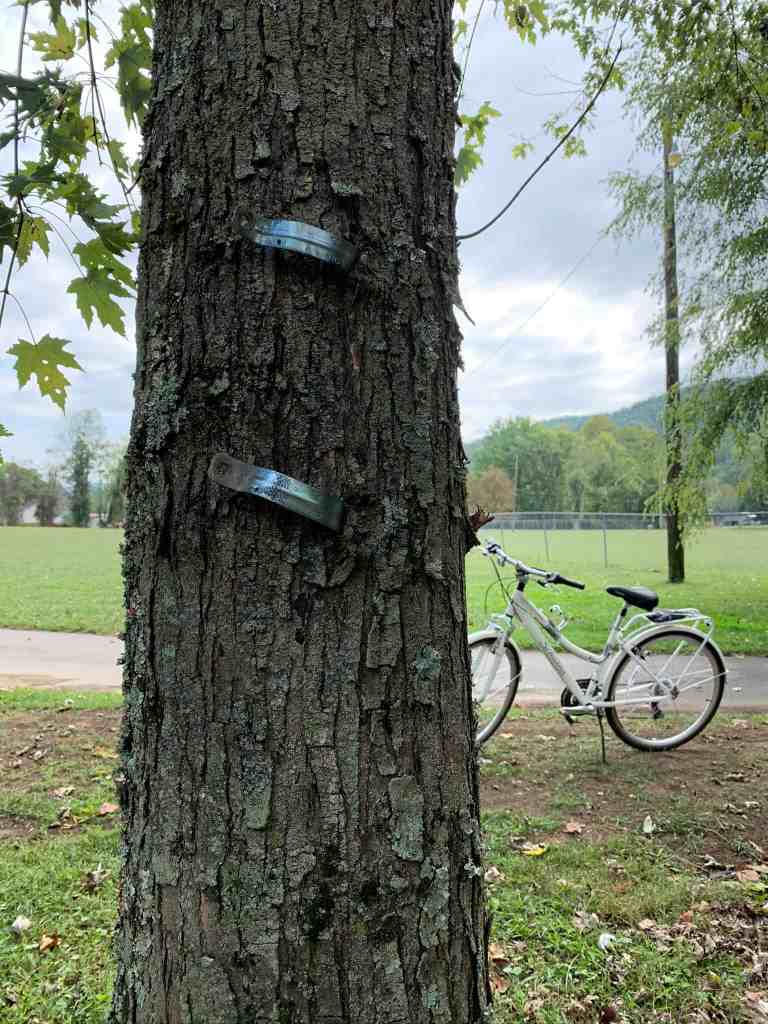 At the next cache location I circled behind a tree looking for the container. In addition to the cache, I found that this tree had outgrown some metal brackets that were attached to it years ago. One end of each bracket was now deeply embedded in the tree. Nature is amazing.
