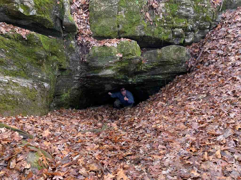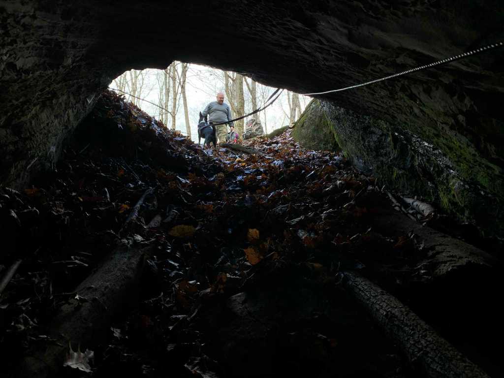 The entrance was down a steep slope from the trail. We could see that the opening was not tall enough to walk through. Someone had rigged a cable to hold onto while entering. Rob suggested that Andy and I wait topside while he crawled down to investigate. He donned his headlamp and carefully made his way down the slope, slippery with a thick layer of fallen leaves, until he could grab the cable and enter the opening.