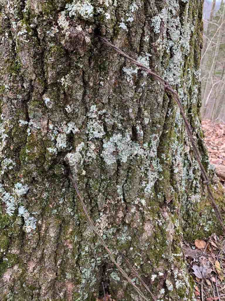 I joined him next to the cache, a nice wooden birdhouse attached to an old tree. Like a tree we had seen the week before, this one had barbed wire going right through the center of it. Nature has a way of reclaiming what man leaves behind.