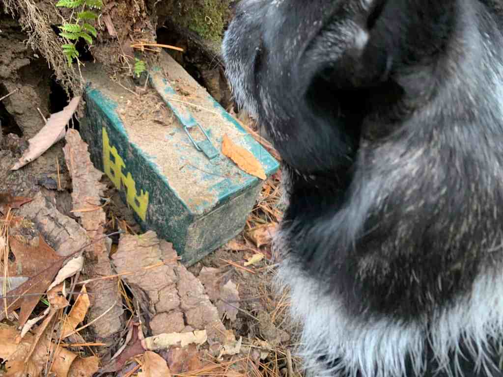 Rob pointed in the general direction of the cache and told me he was walking in the opposite direction to “talk to a tree.” Once he was out of sight I did the same, and then looked around for the cache. I found it easily. It was a big, metal ammo can. On the outside Ang had stenciled the icon for abandoned structures and his name. On the inside of the lid he had taped a trail map of Bays Mountain.