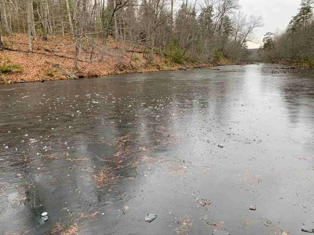 We stopped on the bridge and Rob used his hiking stick to spear the ice, testing it’s strength and depth. He was not able to crack it so it must have been fairly thick here. I enjoyed looking at the interesting patterns it had made while freezing. There was one lonely chunk of ice that stuck up from the rest and I wondered what forces caused it to be in that position.