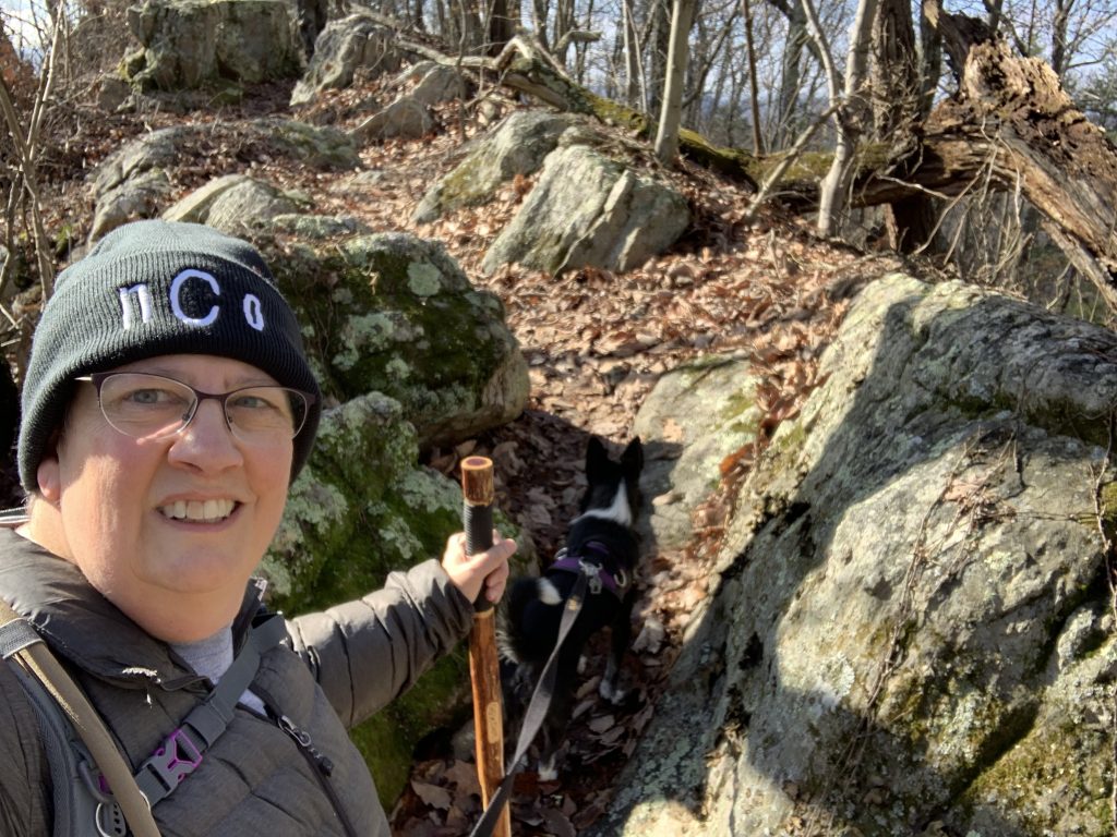 We had only been hiking for a short time when I was momentarily confused as to why I did not seem to have enough hands. Something didn’t seem right as I juggled my hiking stick, my phone that I had pulled out to take a photo, and Andy’s leash. Ah! That was it. I had forgotten to bring along the leash belt that I normally wear around my waist. I am accustomed to having Andy’s leash attached to it so that my hands are free. At our next stop I looped it through my backpack waist belt. Problem solved.