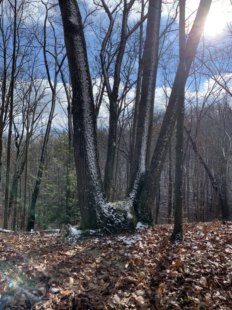 There had been a light snow the night before, and some of that still clung to the ground and to limbs in places.