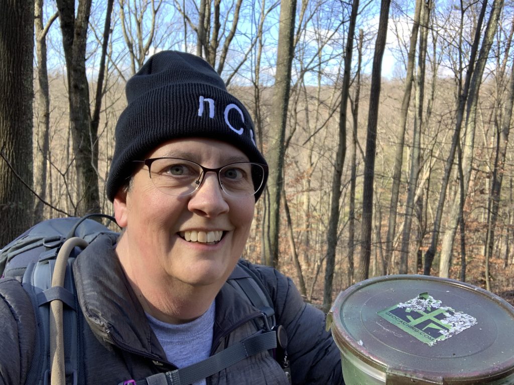 At about the .9 mile mark we left the trail and began bushwhacking over to a cache I found on Black Friday. This is a puzzle cache that has to be solved to earn the coordinates. Rob had also solved it, and was actually the one to build the phenomenal container and place it here, but he had not yet come back to log it. He wasn’t able to hike with me on Black Friday, so we decided to stop today so that he could see how his creation was faring and to sign the log.