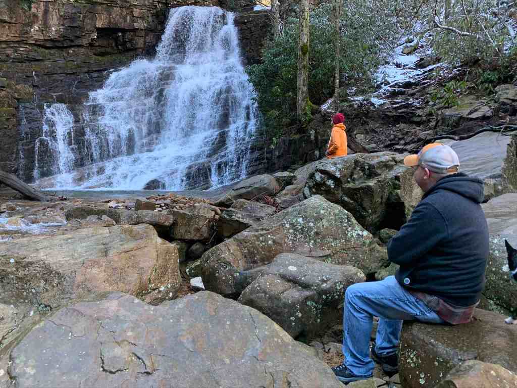 Melissa saw a steep, rocky trail ahead of us and said, “We have to go up that?!” Fortunately, that was the trail for Bullen Hollow, and our path was a much gentler climb. We soon passed a young man hiking back down from the falls alone. We would have the falls to ourselves today.