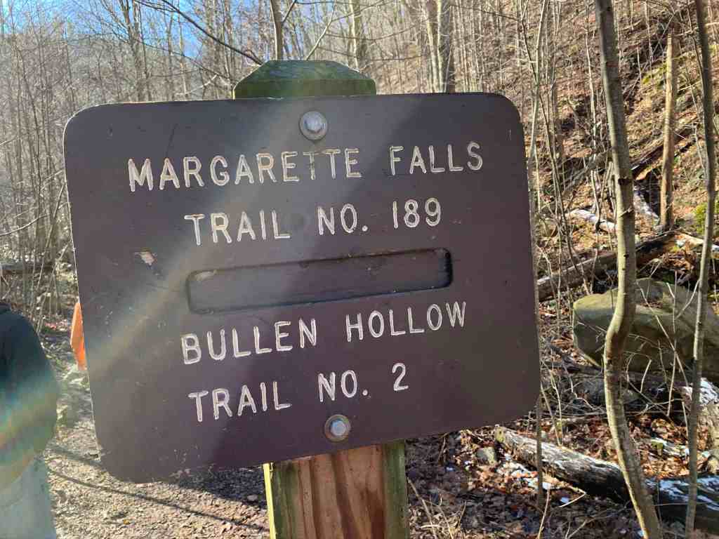 It was a cool 33° when we started the hike, and the skies were sunny and clear. That sun was hidden once we got into the hollow that follows Dry Creek toward the falls. At the .5 mark, the forest road we were following ends. Signs point straight ahead for Margarette Falls and a slight right for Bullen Hollow, while a sign off to the left marks the trail head for Phillips Hollow.