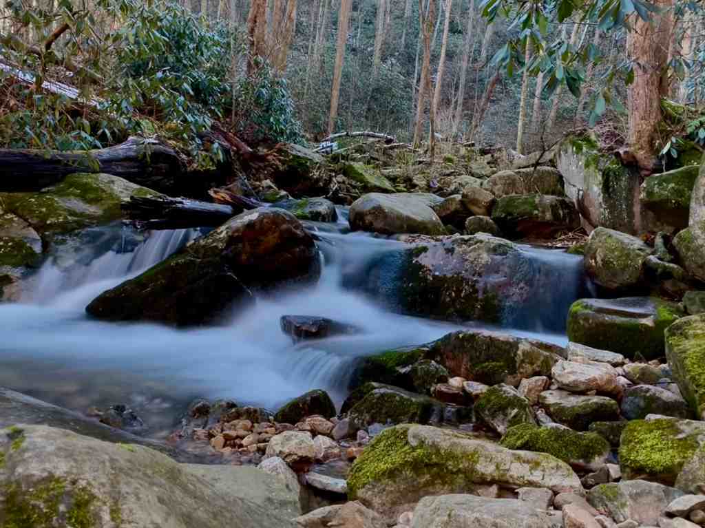 We were making our way slowly up the trail, continuing to stop and photograph the water. The deep shadows in the hollow were very conducive to capturing the movement of the water, and I played with the long-exposure setting on my phone.